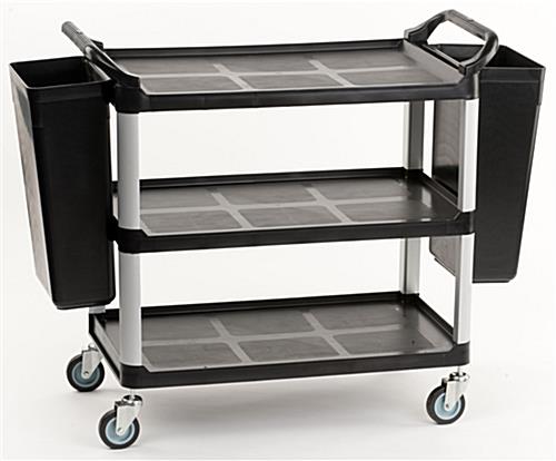 A durable black cart bin designed to attach to utility carts, janitorial carts, or service trolleys. Made from heavy-duty plastic, it is ideal for collecting waste, transporting supplies, or storing cleaning materials. The bin features smooth walls for easy cleaning, reinforced edges for added strength, and a secure mounting design that fits most commercial carts. Perfect for restaurants, hotels, housekeeping, and industrial applications.