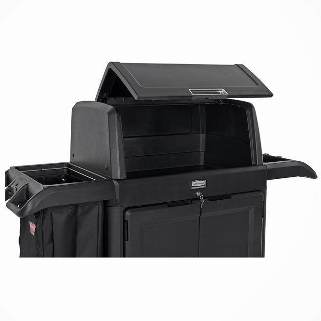 The Full-Size Housekeeping Cart with Hood and Doors is the complete system solution for efficient housekeeping, offering 360° maneuverability and customizable organization with two adjustable shelves.