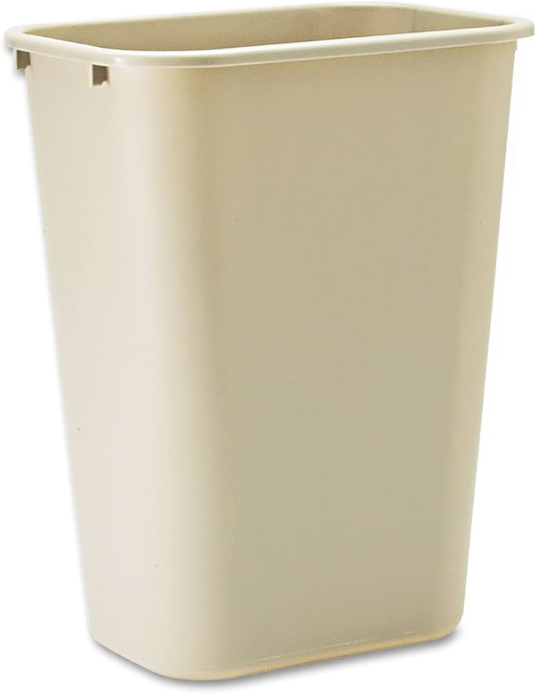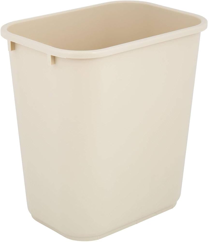 "Durable medium-size rectangular wastebasket in beige. Made from sturdy, easy-to-clean plastic with a space-saving design that fits deskside or under counters. Ideal for offices, homes, and commercial spaces."