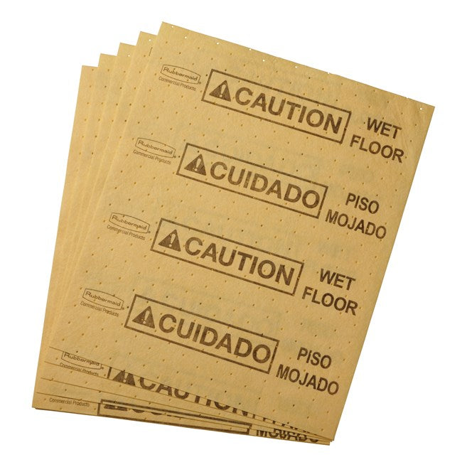 Each yellow pad is coded with universal caution symbol and “Caution Wet Floor” message in English and Spanish.