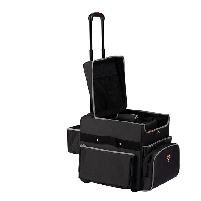 Make cleaning a breeze at your hotel, resort, fine dining establishment, or other facility with this 1902467 Executive quick cart. Designed with a Teflon® fabric protector coating, this sturdy cart's outer shell is designed to repel water, oil, and stains. The high-performance material provides strength and rigidity that guarantees the ability to withstand long-term heavy use, while the black fabric and subtle design allow this cart to easily blend into upscale environments without the bold aesthetics of a regular janitorial cart. A durable aluminum telescoping handle combines with a compact design to provide comfortable navigation through tight spaces, and robust ball-bearing wheels ensure a quiet and dependable ride.
