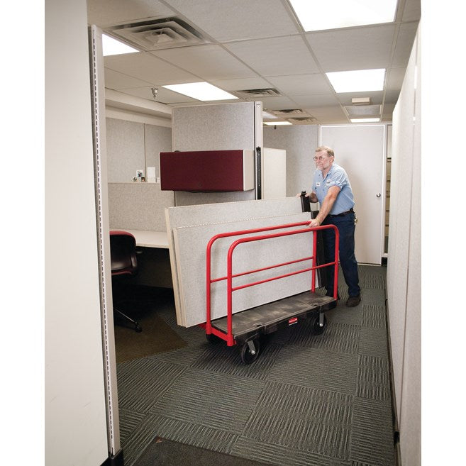 The Rubbermaid Commercial Sheet and Panel Truck has a 2,000-pound capacity and features built-in tie-down slots to secure loads while moving them and a textured surface greatly reduces slippage.