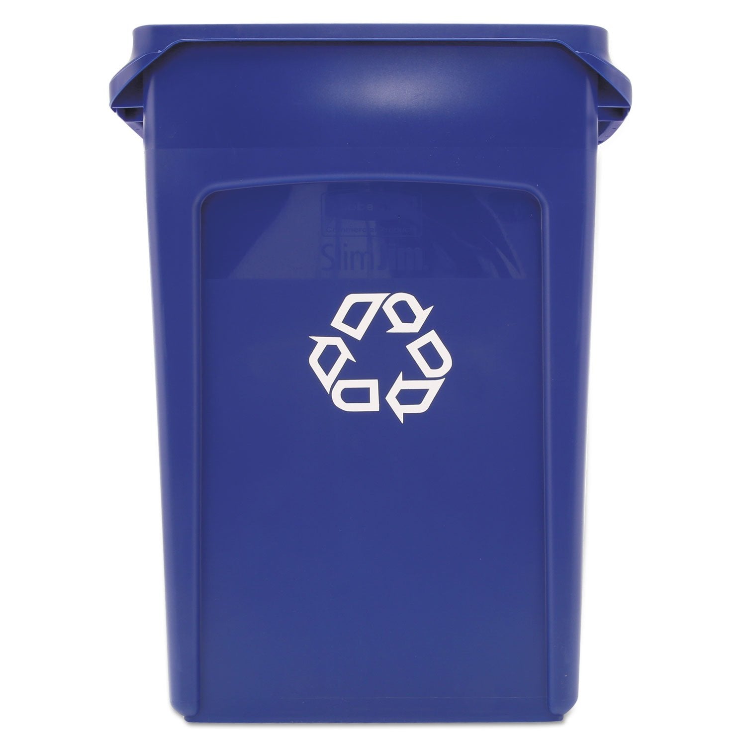 If you're in an environment where there's lots of recycling, make sure Slim Jim is part of your workforce. Features venting channels and four patent-pending cinches that make removal of liners quicker and easier. Design allows you to keep the container in locations where space is a factor.Universal recycling symbol readily identifies receptacle. Molded-in handles and base grip make lifting a snap. Waste Receptacle Type: Recycling Container; Material(s): Plastic; Application: Recycling; Capacity (Volume): 23 gal.