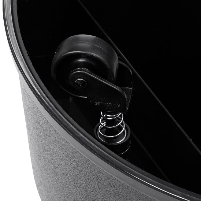 Heavy-duty stepstool glides easily on retractable rubber casters.