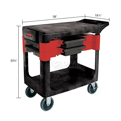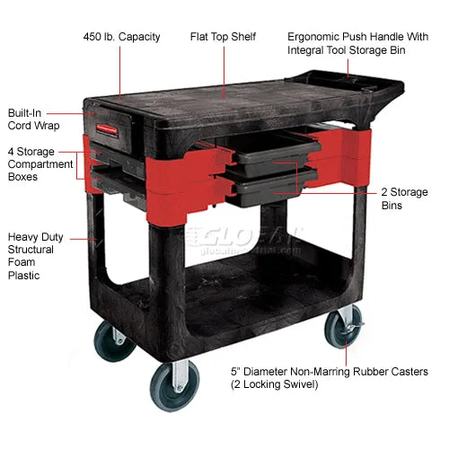 Tool cart features 4 compartmentalized boxes for storing assorted parts and hardware and 2 storage bins for essential tools and supplies. Made with heavy-duty structural foam plastic for long, rugged use. Virtually maintenance free; won't rust, chip or dent. Comfortable ergonomic handle features integral tool storage bin. Flat surface top shelf allows easy unloading/loading of oversized items and provides a convenient work area. Plastic tool cart also features a fixture on front for storing an electrical cord. Utility cart rolls easily on 2 swivel, 2 rigid 5" diameter non-marring rubber casters.