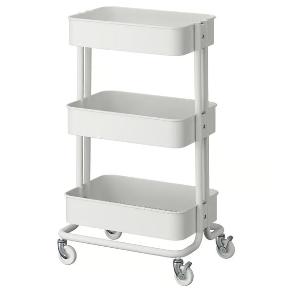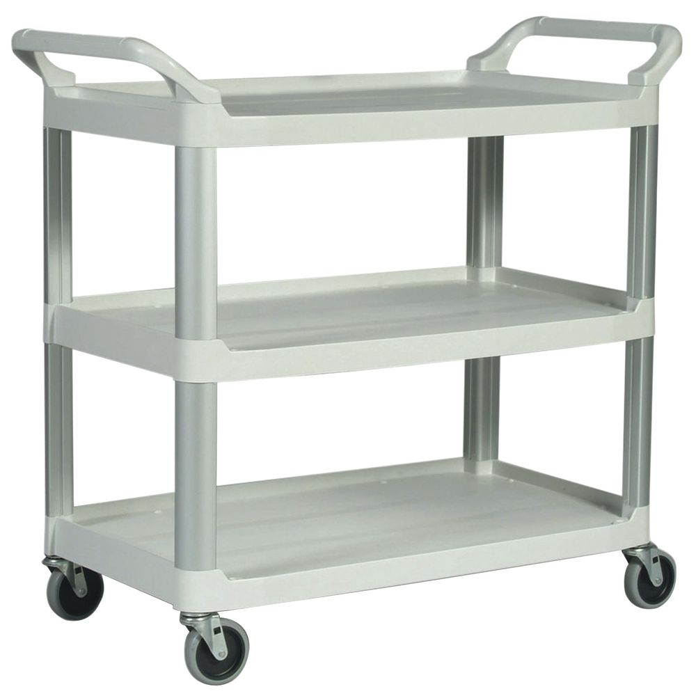 A sturdy and versatile white utility cart designed for transporting supplies, tools, and equipment in commercial, industrial, and household environments. Made from durable, easy-to-clean plastic with smooth shelves and reinforced legs, it offers excellent stability and long-lasting performance. The cart includes ergonomic handles and smooth-rolling wheels for effortless maneuverability. Ideal for restaurants, hospitals, offices, housekeeping, and general storage and transport tasks.